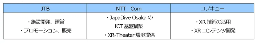 株式会社JTB(本社:東京都品川区、代表取締役 社長執行役員:山北栄二郎、以下「JTB」)、NTTコミュニケーションズ株式会社(本社:東京都千代田区、代表取締役社長:小島克重、以下「NTT Com」)、株式会社NTTコノキュー(本社:東京都千代田区、代表取締役社長:丸山 誠治、以下「コノキュー」)は、2025年の大阪・関西万博、2030年度の大阪IR開業を契機に、更なる増加が見込まれる訪日外国人旅行者向けに、XR技術(注1)を用いた「XR-Theater&Cafe JapaDive Osaka」(以下、JapaDive Osaka)を、2025年4月1日(火)に大阪・道頓堀の中座くいだおれビル5階GIRAFFE Japan内に開設します。また、JTBは同フロアで「Dotonbori Traveler's Lounge」も開設し、道頓堀を訪れる旅行者へくつろぎの空間を提供します。