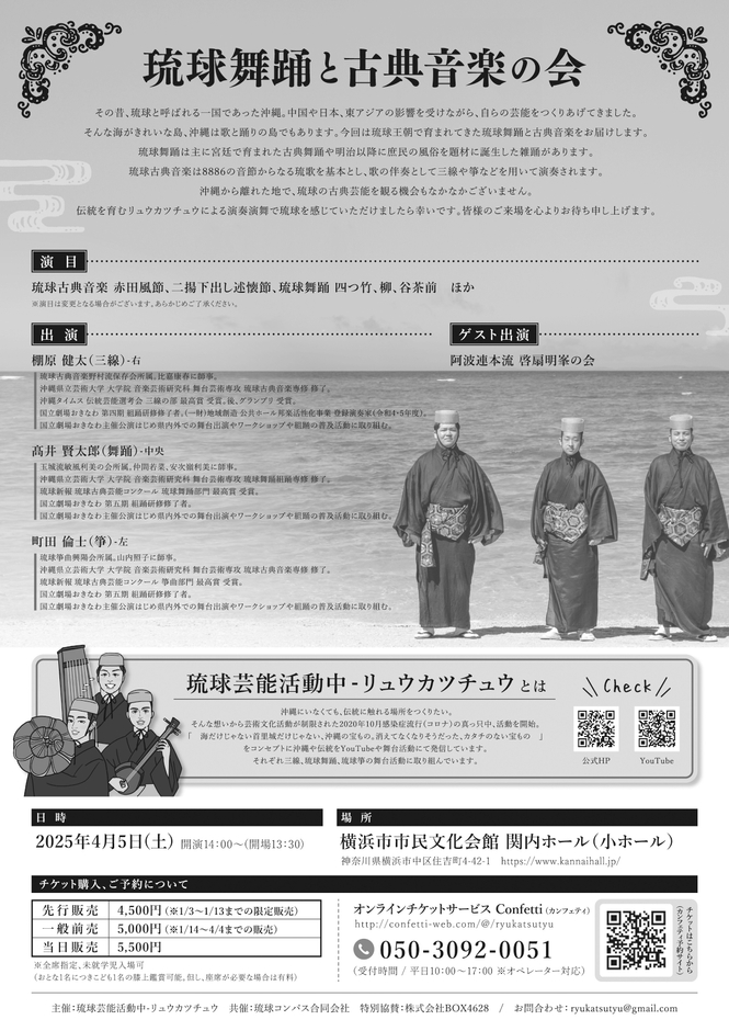 琉球芸能活動中-リュウカツチュウ『琉球舞踊と古典音楽の会』が2025年4月5日 (土)に関内ホール 小ホール(神奈川県横浜市中区住吉町4丁目42-1)にて上演されます。