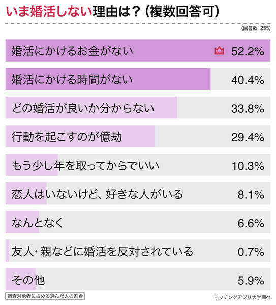 「婚活にかけるお金がない」という理由が52.2%で最も多く、続く「婚活にかける時間がない」は40.4%でした。