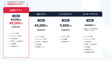 サービス開始を記念して、「生成AIプラン」の初年度ご利用料を特別価格45,000円/月(税別)にてご提供いたします。通常価格60,000円/月(税別)のところ、生成AI搭載のチャットボットとしては他に類を見ないコストパフォーマンスです。低コストだけでなく、使いやすさと機能性も兼ね備えた「Tebot」は、ユーザーの自己解決率向上から顧客獲得までの実現を可能にします。