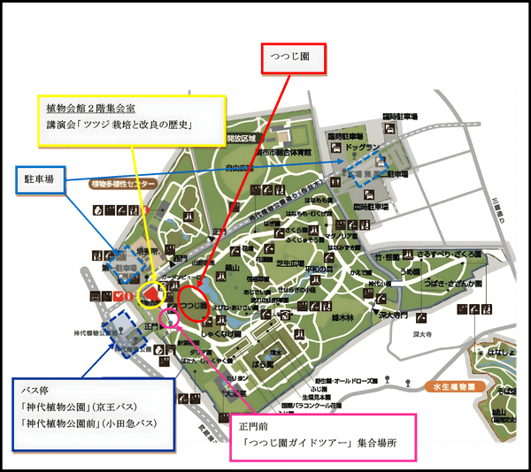 ・調布駅から小田急バス吉祥寺駅または三鷹駅行き「神代植物公園前」下車、または京王バス深大寺行き「神代植物公園」下車