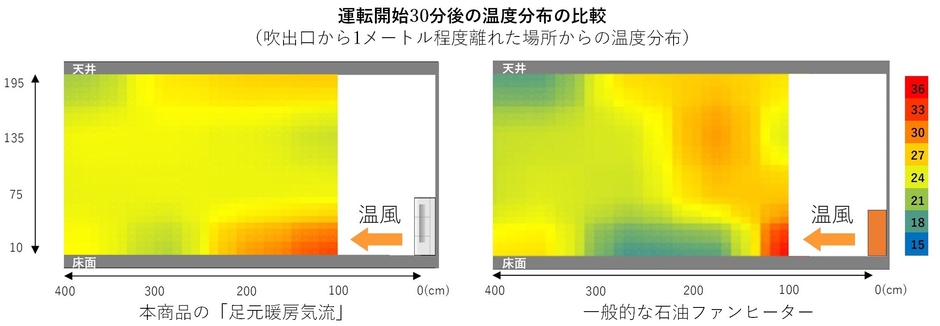 北海道旭川市の実験施設「ダイキン旭川ラボ」にて、本商品と一般的な石油ファンヒーターを対象に行った比較検証では、床上10cmの高さでの30℃の温風到達距離は、一般的な石油ファンヒーターが約110cmだったのに対して、「足元暖房気流」は約1.6倍の距離に相当する約175cmという結果となりました。