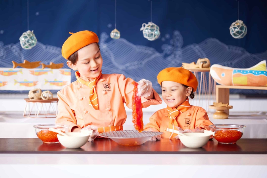 鮭の切り身をイメージしたタイとサロンを巻き、コックコートに着替え、いくら作りに挑戦します。これは、下処理された鮭から筋子を取り出し、ぬるま湯でほぐし、醤油ダレに漬けこむ体験です。さらに、スタッフと鮭をさばきながら、鮭の部位について学びます。自分で仕込んだ鮭の身やいくらは夕食に使用したり、翌日の朝食で食べたりすることができます。