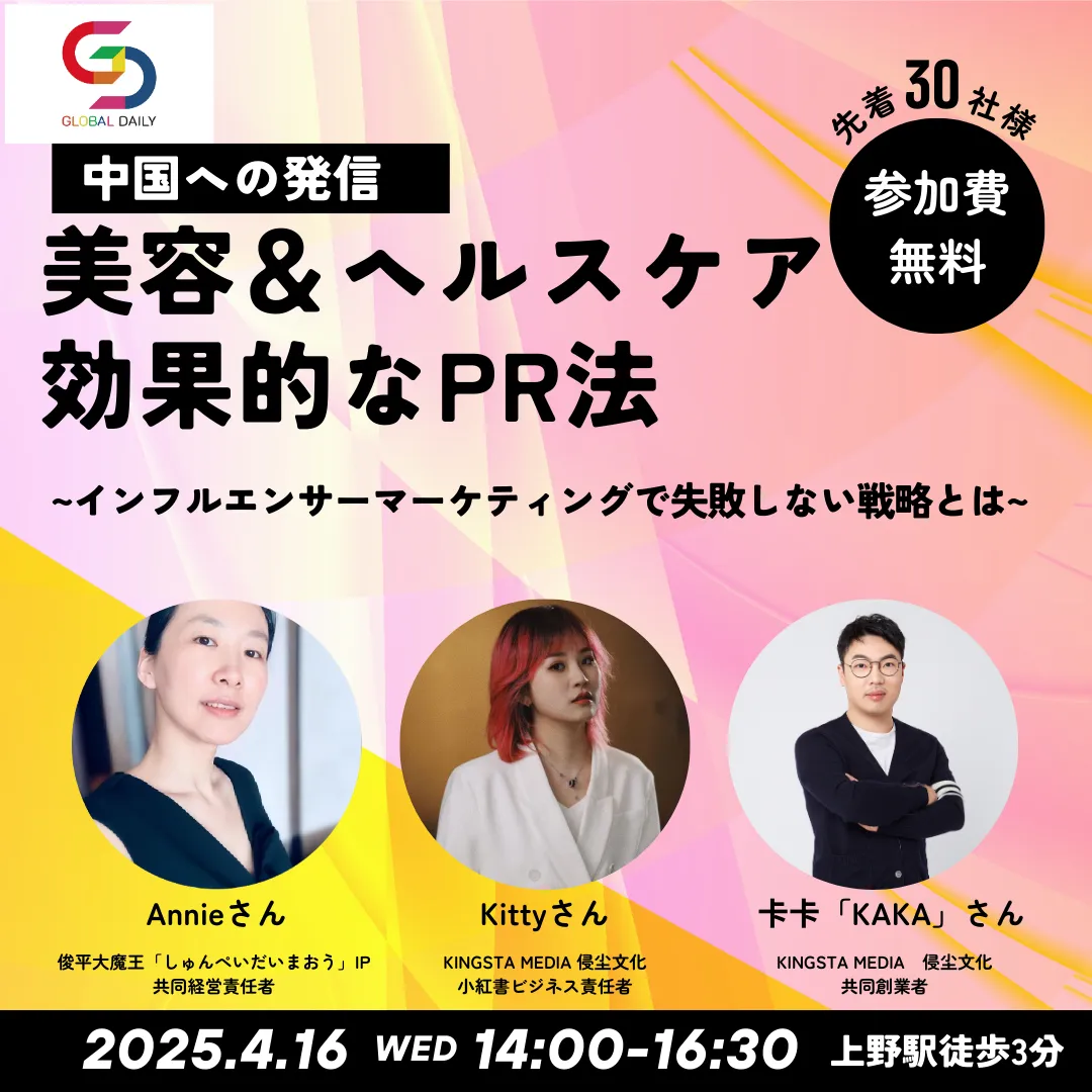 この度、株式会社グローバル・デイリー(本社:東京都台東区、代表取締役社長 石川和則)は、化粧品開発者・アロマセラピストとしての専門的な背景を持ち、信頼性の高い情報を発信している美容・健康系インフルエンサー「俊平大魔王氏」のマネージメント兼共同責任者のAnnieと中国最大級RED専門インフルエンサーMCN機構の中国侵塵文化KINGSTA MEDIAとの共同開催で、中国最前線のビューティー&ウェルネス事例や中国REDインフルエンサーのマーケティング事例やインフルエンサーを効果的に活用するノウハウなどについてのセミナーを開催します。