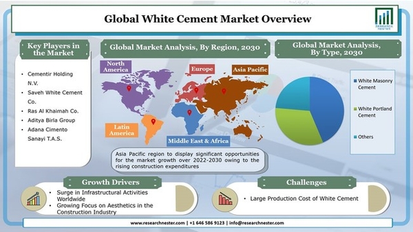 Research Nester Private Limitedは調査レポート「ホワイトセメント市場:世界的な需要の分析及び機会展望2030年」2021年11月 16日 に発刊しました。このレポートは、予測期間中に市場の成長を促進すると予測されるいくつかの要因とともに、成長ドライバー、市場機会、課題、脅威などの市場ダイナミクスを強調しています。さらに、このレポートは、SWOT分析、PORTERの五つの力の分析、PESTEL分析など、いくつかの分析ツールを利用して予測評価を提供します。