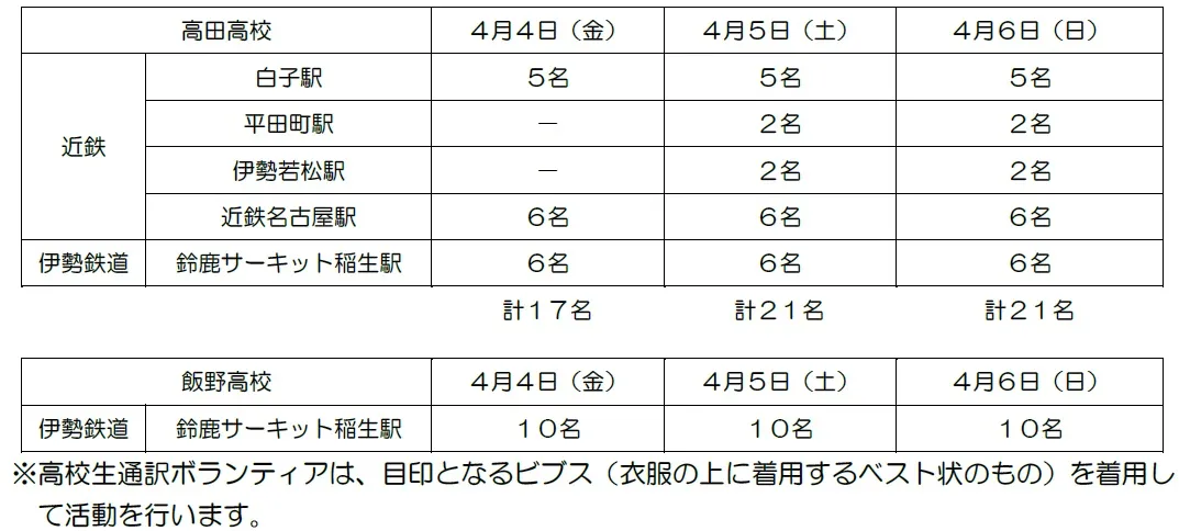近畿日本鉄道株式会社(以下「近鉄」)と伊勢鉄道株式会社(以下「伊勢鉄道」)は、学校法人高田学苑高田高等学校(以下「高田高校」)と三重県立飯野高等学校(以下「飯野高校」)と連携し、「F1日本グランプリレース」開催期間中の4月4日(金)から6日(日)までの間、近鉄の白子駅、平田町駅、伊勢若松駅、近鉄名古屋駅および伊勢鉄道の鈴鹿サーキット稲生駅の合計5駅で、高田高校と飯野高校の生徒を通訳ボランティアとして迎え、インバウンドのお客さまを案内します。同期間に高校生通訳ボランティアを迎えるのは、昨年に引き続き2回目(近鉄名古屋駅は初めて)です。