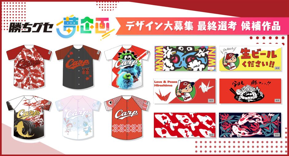 広島ホームテレビ(広島市中区)は、広島のスポーツをみなさんと盛り上げていくため『勝ちグセ夢企画』第1弾としてカープ応援オリジナルグッズのデザインを募集し、応募のあった150点のうち12点を最終候補として決定しました。