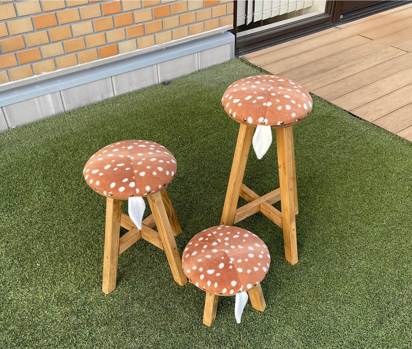 アンティーク調の木製の脚、奈良公園の小鹿を思い出させる鹿子柄のフェイクファー、ちょこんと飛び出た白い尻尾が特徴です。