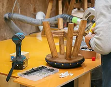 座面に使用しているフェイクファーは以前当社で企画・販売をしたアパレル商品の布生地で、本商品は東大阪市のスツール工房「tsukuru Woodwork Fujimoto」と作り上げたアップサイクル品となっています。