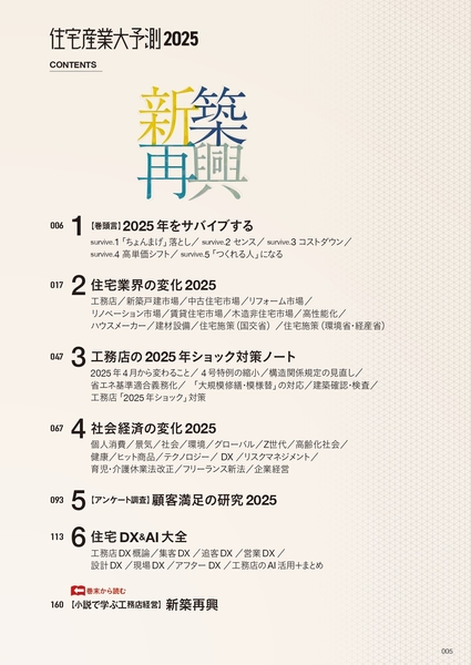 工務店・住宅業界関係者が2025年に知っておくべきポイントをピックアップしているので、業界の市場や現状などを把握する実用書や新年の経営指針の参考書として、毎年多くの住宅業界に関わる人に読まれています。