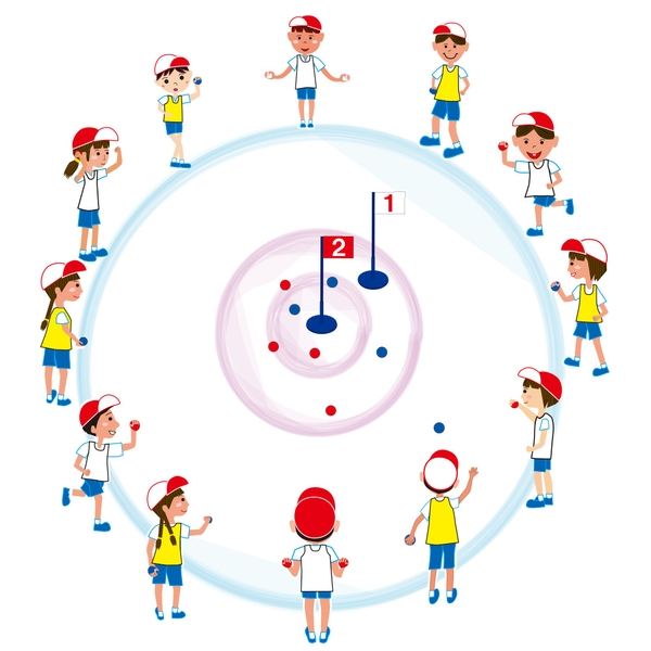 一番外の大きな円のまわりから中心を狙ってボールを投げる。