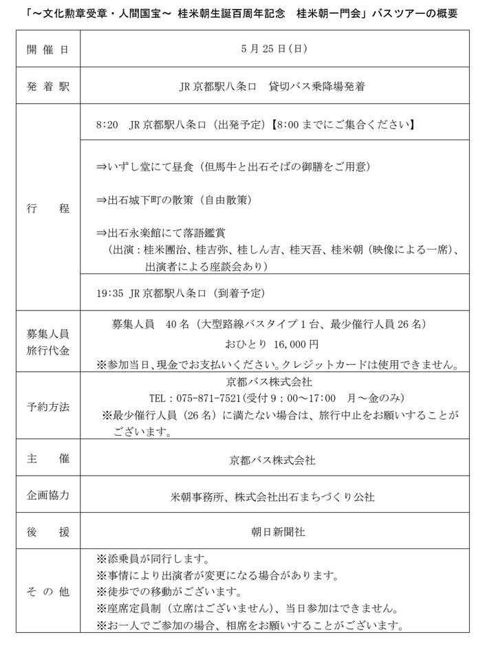京都バス主催バスツアー 朝日永楽館落語 「~文化勲章受章・人間国宝~ 桂米朝生誕百周年記念 桂米朝一門会」を販売開始