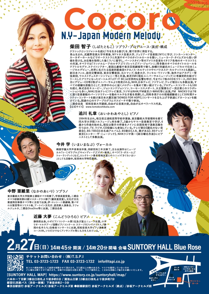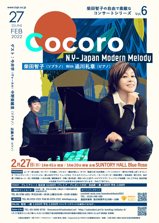 株式会社T.S.PROJECT INTERNATIONAL(東京都目黒区、代表:柴田智子)主催による、柴田智子の自由で素敵なコンサートVol.6「~Cocoro~ N.Y-Japan Modern Melody」が2022年2月27日(日)にサントリーホール ブルーローズ(東京都港区)にて開催されます。チケットはカンフェティ(運営:ロングランプランニング株式会社、東京都新宿区、代表取締役:榑松 ⼤剛)にて発売中です。