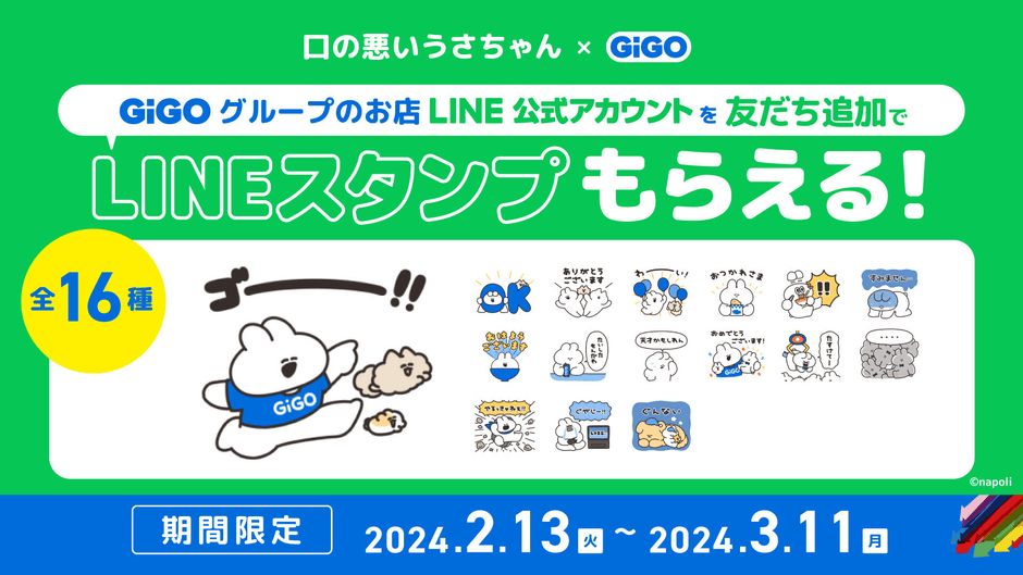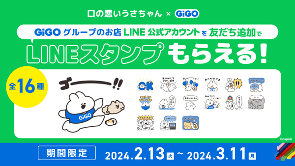 株式会社GENDA GiGO Entertainment(本社:東京都港区 代表取締役社長:二宮 一浩 以下当社)は、大人気キャラクター「口の悪いうさちゃん」とのコラボLINEスタンプ(全16種)を、2024年2月13日(火)~3月11日(月)までの期間限定で無料配信いたします。GiGOグループのお店のLINE公式アカウントを友だち追加いただくことで、無料でダウンロードいただけます。