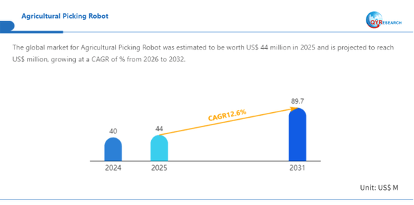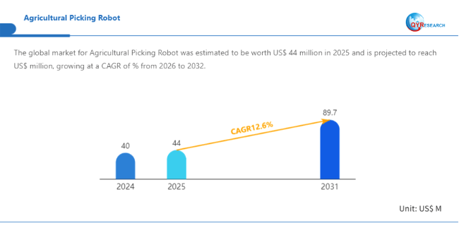 QYResearchが発表した新たな市場調査レポート「農業用ピッキングロボット―グローバル市場シェアとランキング、全体の売上と需要予測、2026~2032」によると、世界の農業用ピッキングロボット市場規模は2024年の約40百万米ドルから2025年の44百万米ドルへと順調に拡大すると見込まれ、予測期間中は年平均成長率(CAGR)12.6%で成長し、2031年には89.7百万米ドルに達すると予測されている。