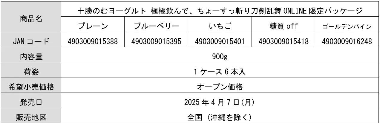 日清ヨーク株式会社(社長:前田 健二)は、「十勝のむヨーグルト」が「刀剣乱舞ONLINE」とコラボレーションし、「十勝のむヨーグルトを極極(ごくごく)飲んで、ちょーすっ斬りキャンペーン」を2025年4月7日(月)より実施します。応募者全員に、「刀剣乱舞ONLINE」のゲーム内で使えるコラボオリジナルの便利道具『十勝のむヨーグルト』をプレゼントするキャンペーンです。
