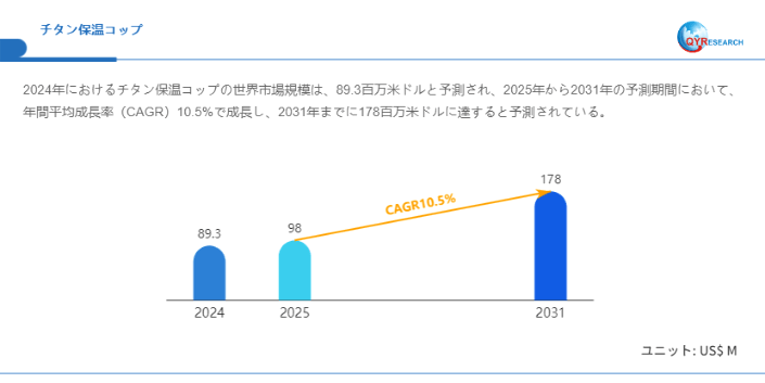 QYResearchが発表した新たな市場調査レポート「チタン保温コップ―グローバル市場シェアとランキング、全体の売上と需要予測、2025~2031」によると、世界のチタン保温コップ市場規模は2024年の約89.3百万米ドルから2025年の98百万米ドルへと順調に拡大すると見込まれ、予測期間中は年平均成長率(CAGR)10.5%で成長し、2031年には178百万米ドルに達すると予測されている。