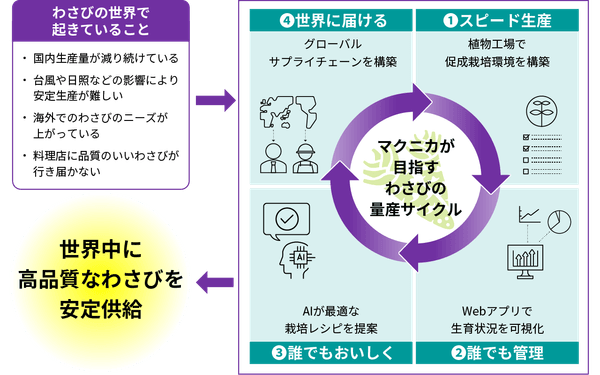 今回マクニカは、NEXTAGEの植物工場にFarmalizeで提供するシステムを導入することで、AIとセンシングを活用したわさびのレシピ(栽培計画)探索と栽培管理を支援します。適切な栽培管理を生産者にリアルタイムに共有することで、植物工場参入に必要な専門知識を不要にします。また、生育データをもとに、作物の味や促成栽培の分析を可能にします。さらに、10社以上の農業DXを支援して得られたセンシングの知見を活かし、高精度センサー、自動収穫ロボット、植物育成用LED等にAI/DXを組み合わせることで、設備を含めたトータルコストを最適化します。