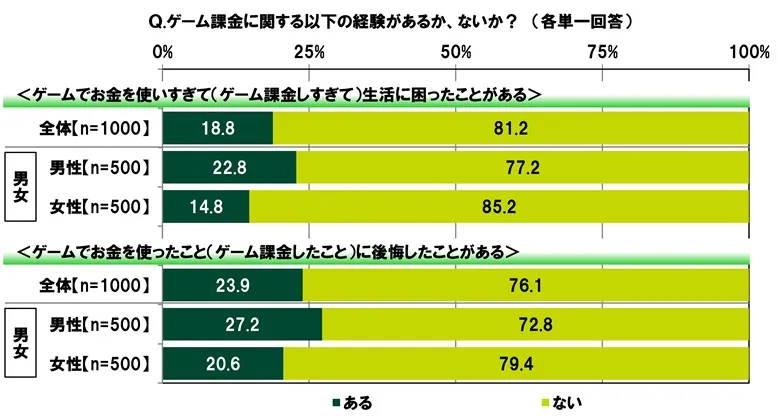 また、ゲーム課金での経験を聞いたところ、<ゲームでお金を使いすぎて(ゲーム課金しすぎて)生活に困ったことがある>では「ある」は18.8%、<ゲームでお金を使ったこと(ゲーム課金したこと)に後悔したことがある>では「ある」は23.9%と、ゲームへの課金がきっかけで苦い経験をした人は少なくないようです。