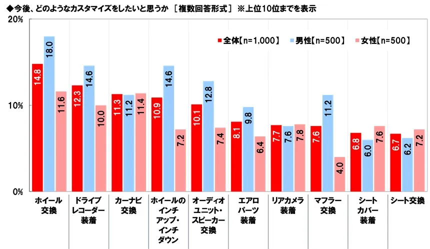 男女別にみると、男性では「ホイール交換」が18.0%、「ホイールのインチアップ・インチダウン」が14.6%、「オーディオユニット・スピーカー交換」が12.8%、「マフラー交換」が11.2%と、女性(順に11.6%、7.2%、7.4%、4.0%)と比べて5ポイント以上高くなりました。