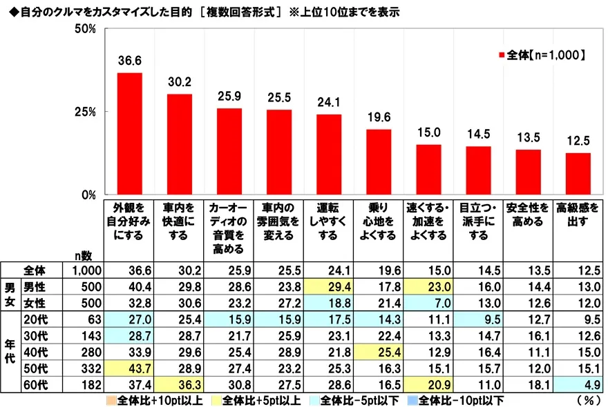 年代別にみると、40代では「乗り心地をよくする」(25.4%)、50代では「外観を自分好みにする」(43.7%)、60代では「車内を快適にする」(36.3%)と「速くする・加速をよくする」(20.9%)が全体と比べて5ポイント以上高くなりました。