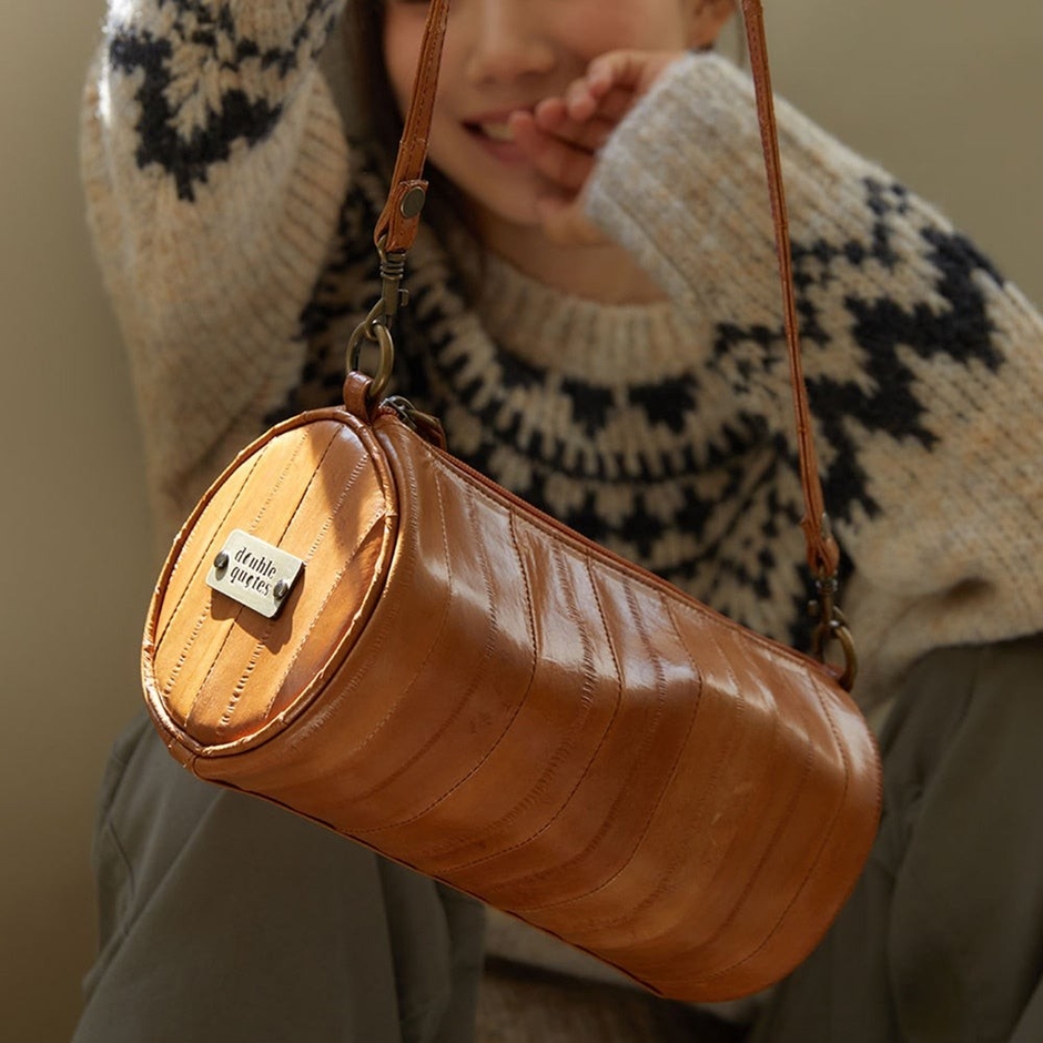 円筒形のショルダーバッグで、側面中央のメタルプレートロゴがポイントです。外側にも内側にもポケットがあるので、小物も収納できます。イールスキンならではの高級感と驚くほどの軽さをお楽しみください。ショルダーストラップ:60㎝