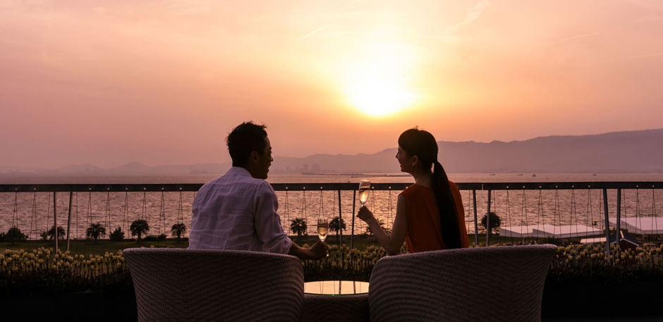夜は庭に足を運び、満天の星空を仰ぎながら夜風に身を委ね、思考をそっと手放す静かなひとときを。客室テラスでは、煌めくベイエリアの夜景を眺めながら、“何もしない贅沢”を存分に味わってください。