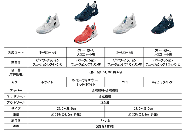 ヨネックス株式会社(代表取締役社長:林田草樹)は、新衝撃吸収反発素材「パワークッション®プラス」を搭載し、足を包み込む新設計パーツ「フュージョンウイング」採用によりフィット性を高めたテニスシューズ「POWER CUSHION FUSIONREV 4」を2021年2月下旬より発売いたします。