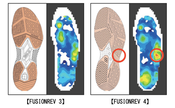 「FUSIONREV 3」では分断されていた、アウトソールの前足部と後足部の外側ラバーをつなげることで、接地面積が増大。グリップ力とねじれに対する剛性が向上し、素早い切り返しを生み出します。