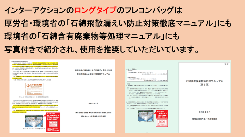 ■このマニュアルにより、アスベストレベル3のスレート板等の長尺物は、原則、原形のまま解体することが規定され、併せて原形のまま収集・運搬することが原則義務化され、我が社のロングタイプのフレコンバッグは、この基準内容に準拠したものであるとして上記のマニュアルにも写真入りで紹介されています。