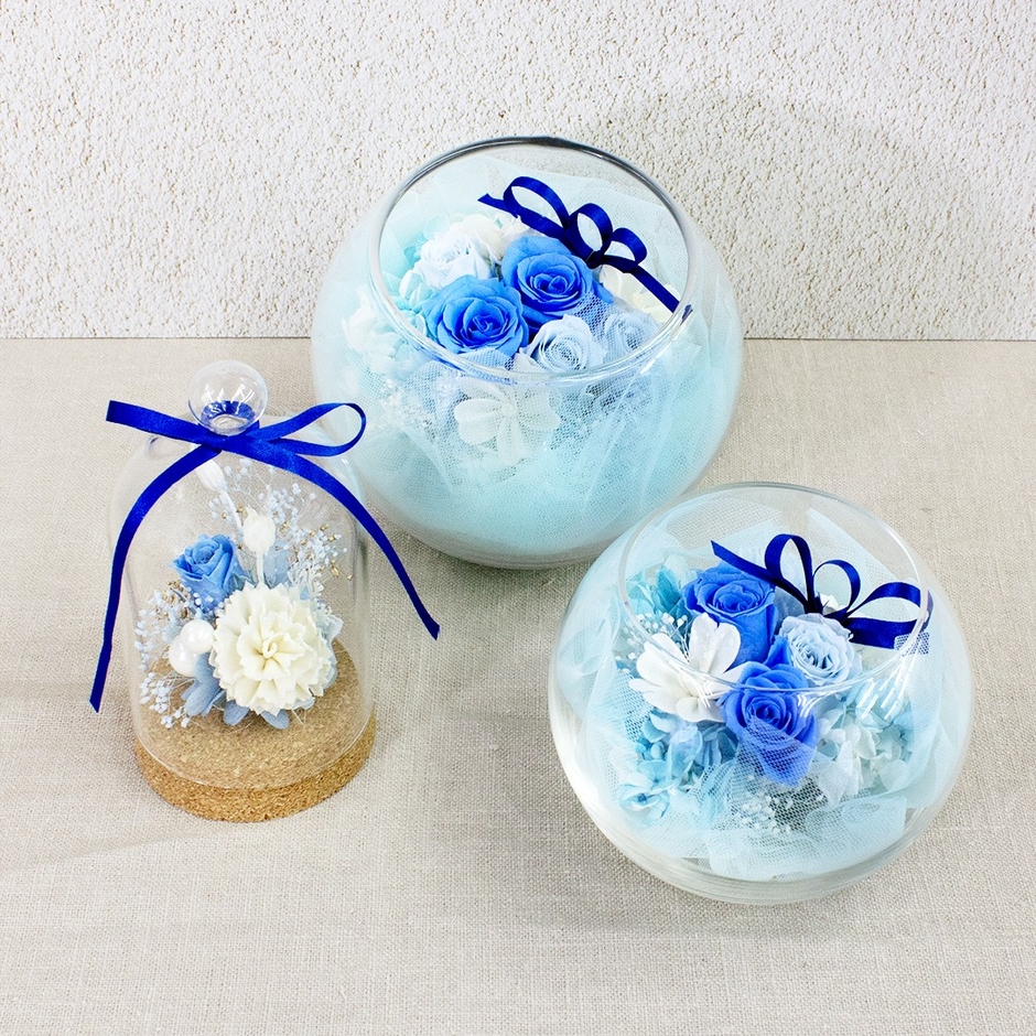 シンデレラの物語からインスピレーションを受けたブルーのプリザーブドフラワーアレンジ。
