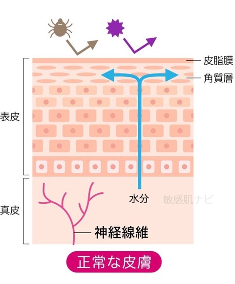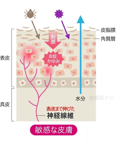 感度の高い神経が表面近くまで伸びると、普段は無視できる刺激にも過剰反応して「かゆい」「痛い」と脳に信号を送り続け、これが敏感肌の不快感の一因と考えられています。