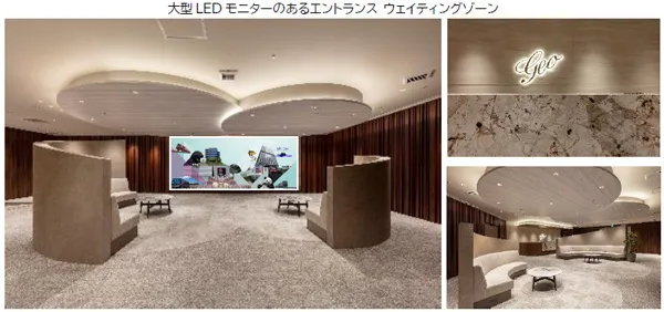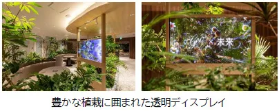 豊かな植栽の演出により、まるで森林の中にいるような癒しの空間をサロン内に創出。リラックスしてお過ごしいただける環境を提供いたします。ここでは、緑の中に透明ディスプレイを設置し、当社の事業展開やSDGs施策など、“今と未来”の取組を紹介します。