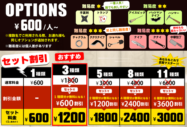 オプションは1種類600円となりますが、3種セット、5種セット、8種セット、10種、11種セットのセット割引を用意しています。