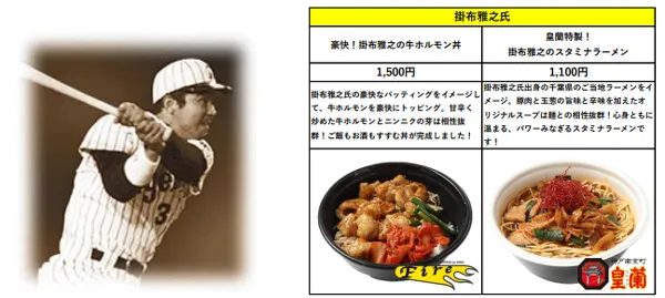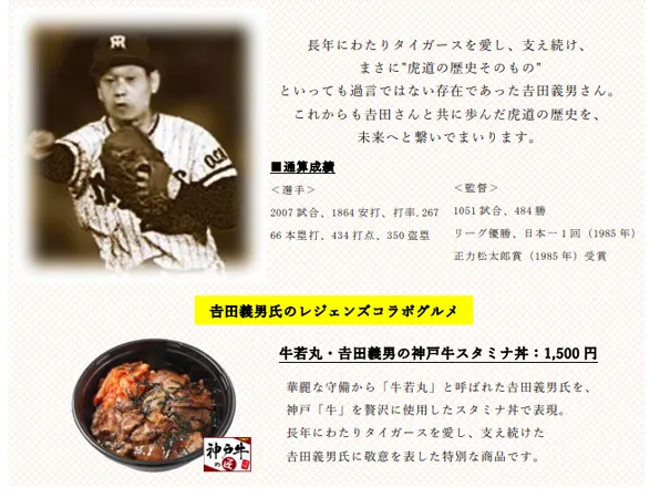 選手・監督として長年にわたりタイガースを愛し、支え続けた吉田義男氏からご了承いただいていた「牛若丸・吉田義男の神戸牛スタミナ丼」のほか、阪神タイガースOB会 会長を務める掛布雅之氏の「皇蘭特製!掛布雅之のスタミナラーメン」など、全10名・15商品をご用意しております!タイガース90周年記念イヤーでしか食べられない特別なグルメをぜひご賞味ください!