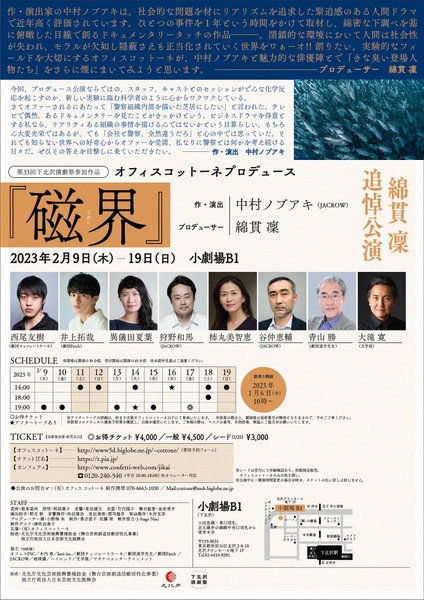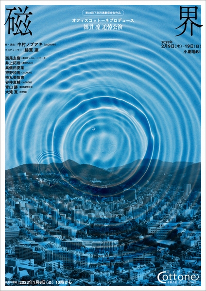 (有)オフィスコットーネ主催、オフィスコットーネプロデュース 綿貫 凜 追悼公演 第33回下北沢演劇祭参加作品『磁界』が2023年2月9日(木)~2月19日(日)に小劇場 B1(東京都世田谷区北沢2-8-18 北沢タウンホ-ル地下1階)にて上演されます。