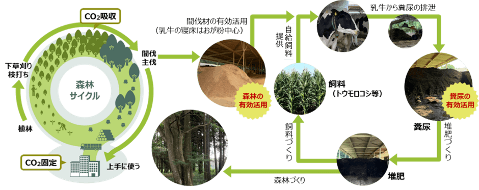 ①自然と100年以上共生し続ける中、自社畑の牧草・コーンにより乳牛を育て、牧場内の牧草を食べた牛の排泄物はたい肥原料の一部とし、再び土づくり、牧草づくりへと循環させる「持続可能な循環型酪農」に取り組み、環境負荷削減、食の安全、社会的価値の創造に対しひとつの回答を示すことを目標としています。