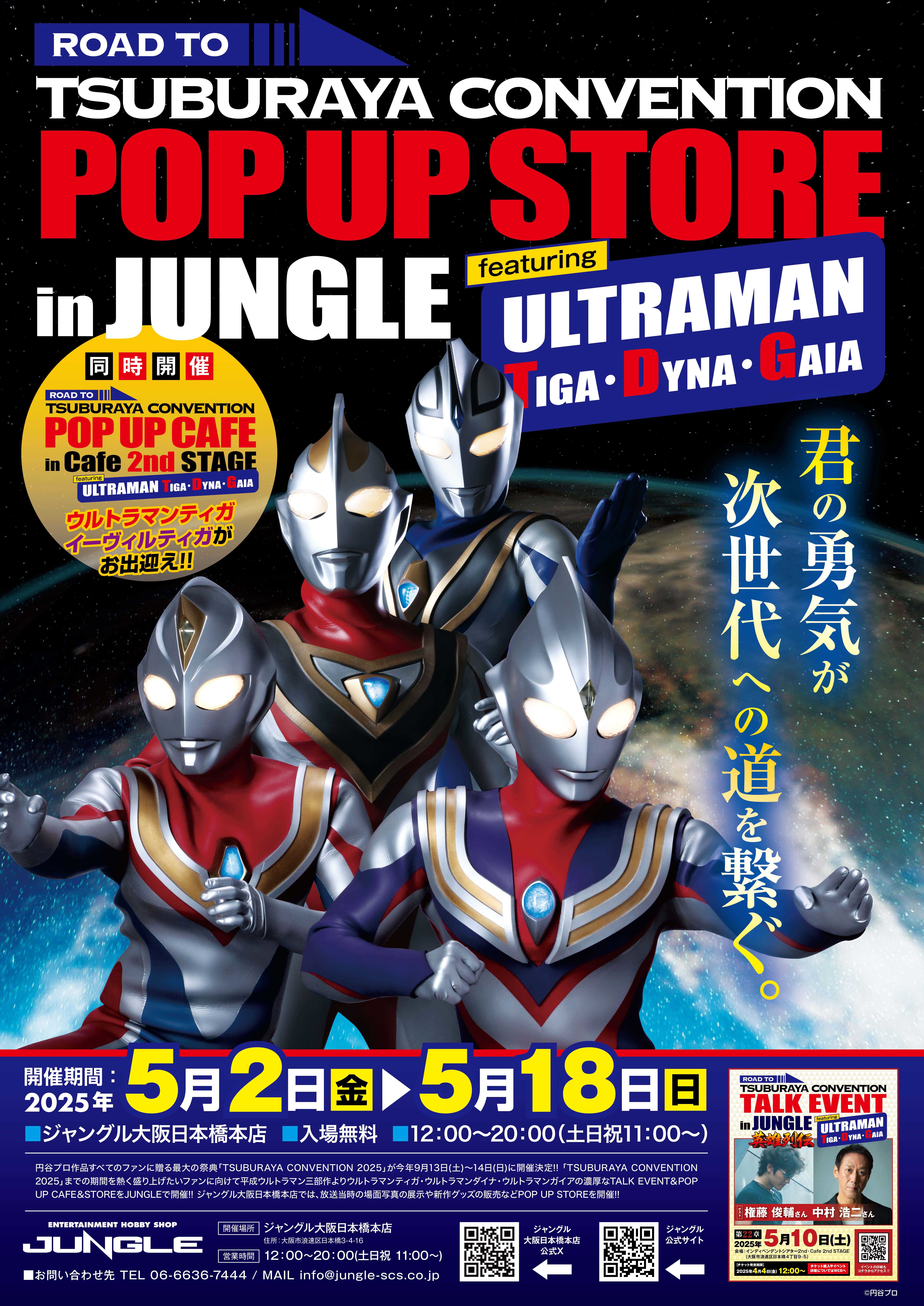 ROAD TO TSUBURAYA CONVENTION POP UP STORE in JUNGLE featuring ULTRAMAN TIGA・DYNA・GAIAを、同期間の2025年5月2日(金)から5月18日(日)までJUNGLE大阪日本橋店にて開催いたします。