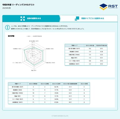 RST-マイアセス連携版では、東京書籍の販売ルートやマイアセスのID(total ID)を利用できるため、学校・教育委員会がRSTの受検を申し込む際の手続き、および、受検する児童生徒のID入力作業の負担が軽減されます。また、受検結果はマイアセスのフォーマットにあわせて表示されるため、レーダーチャートを用いた問題タイプ別の能力値比較や、教育委員会資料の無償提供が加わります。児童生徒の読解力の傾向がより詳細に掴め、授業改善をさらに進めることができます。