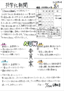 同キャンパスで、それぞれの運営を行ってきた女子部と男子部が統合するにあたり、生徒たちが話し合ってきたテーマは、「校舎」「制服」「委員(生徒会)の役割や選挙の方法」「中高のつながり」など、多岐にわたります。ファシリテーションも学びながら自分たちで行うようになり、話し合いの経緯をまとめた「共学化新聞」を全校生徒が見られる廊下やトイレに掲示して、進捗状況を随時共有しています。