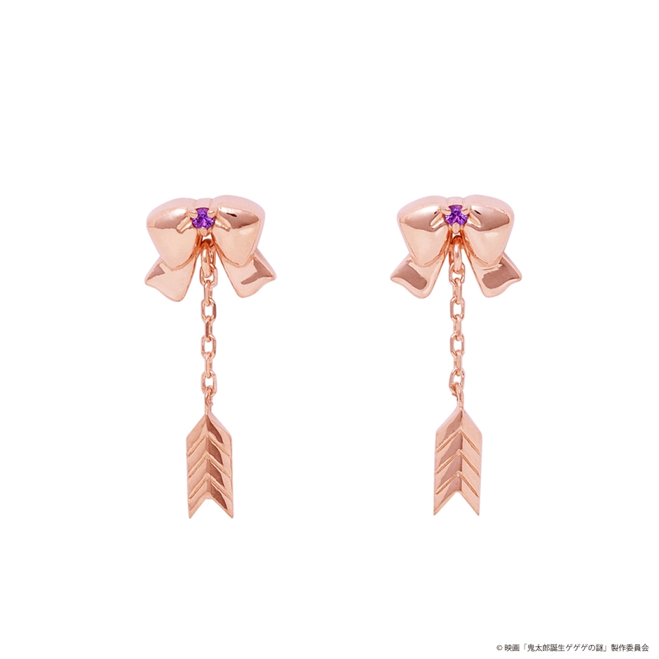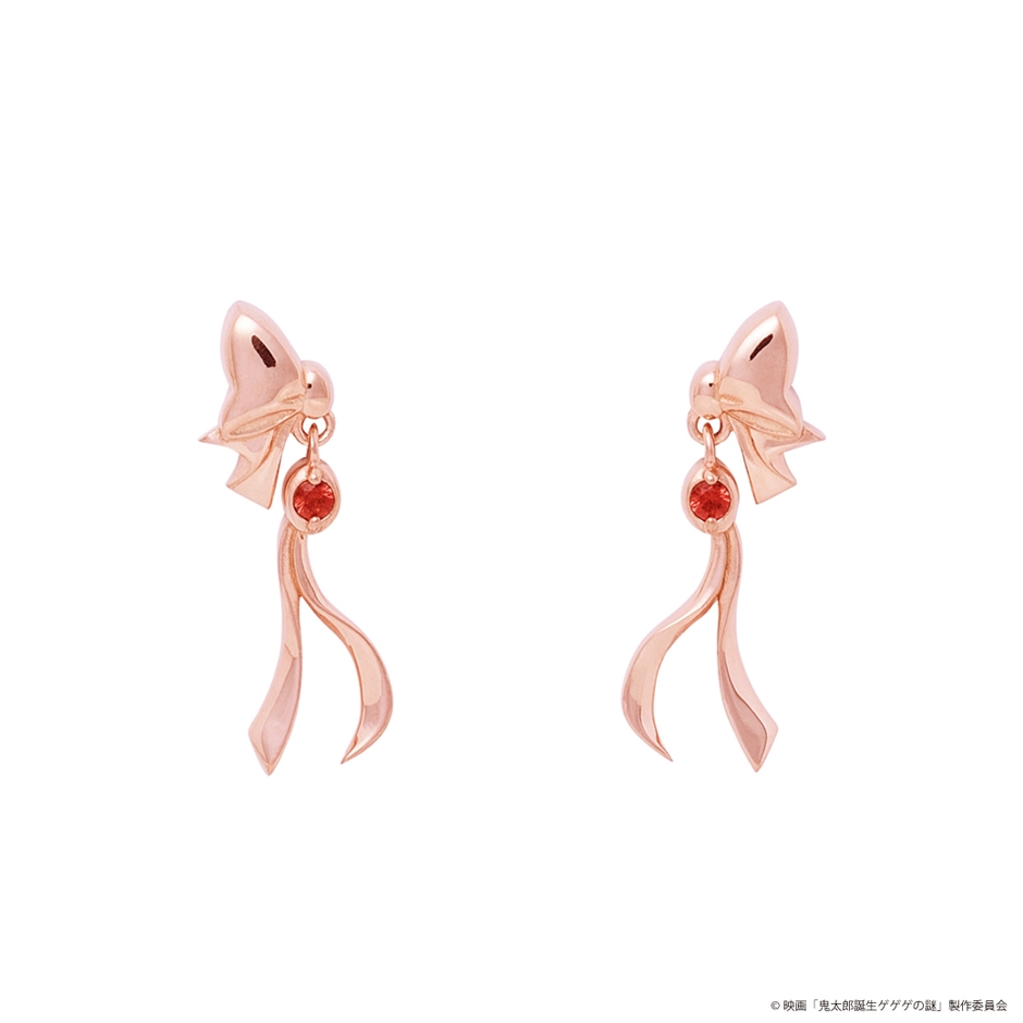 リボンとブローチをモチーフに取り込んだ揺れるデザインに、スカートやチョーカーの色をイメージしたカラーストーンをセット。可愛らしいピンクゴールドカラーで仕上げました。