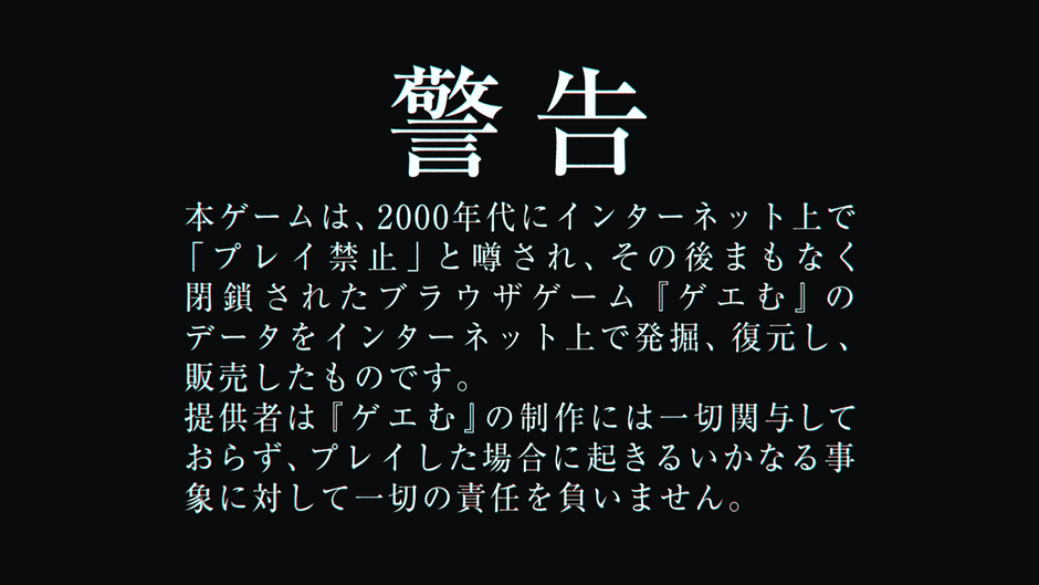 2000年代にインターネット上で「プレイ禁止」と噂され、その後まもなく閉鎖された都市伝説的ブラウザゲーム『ゲエむ』。本作は、そのデータを発掘、復元し、販売したものです。提供者であるSCRAPは『ゲエむ』の制作には一切関与しておらず、プレイした場合に起きるいかなる事象に対して一切の責任を負いません。取り扱いには十分に注意してください。