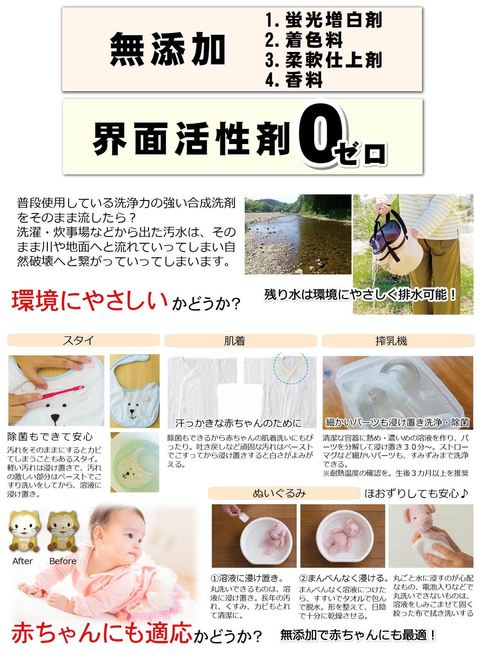 ・界面活性剤不使用の無添加設計で、環境にもやさしく赤ちゃんや敏感肌の方にも安心。