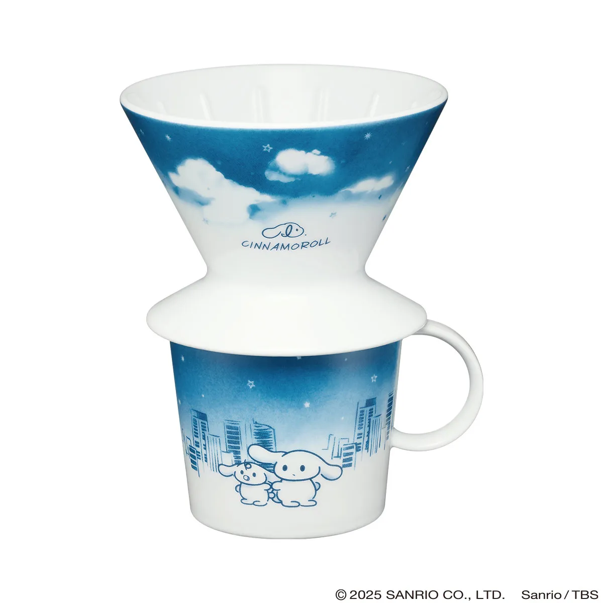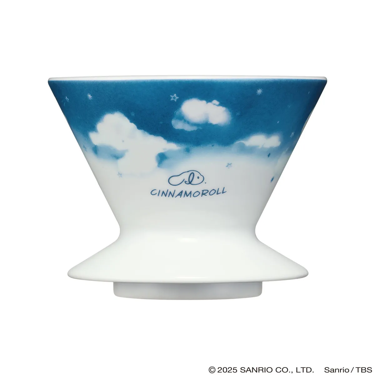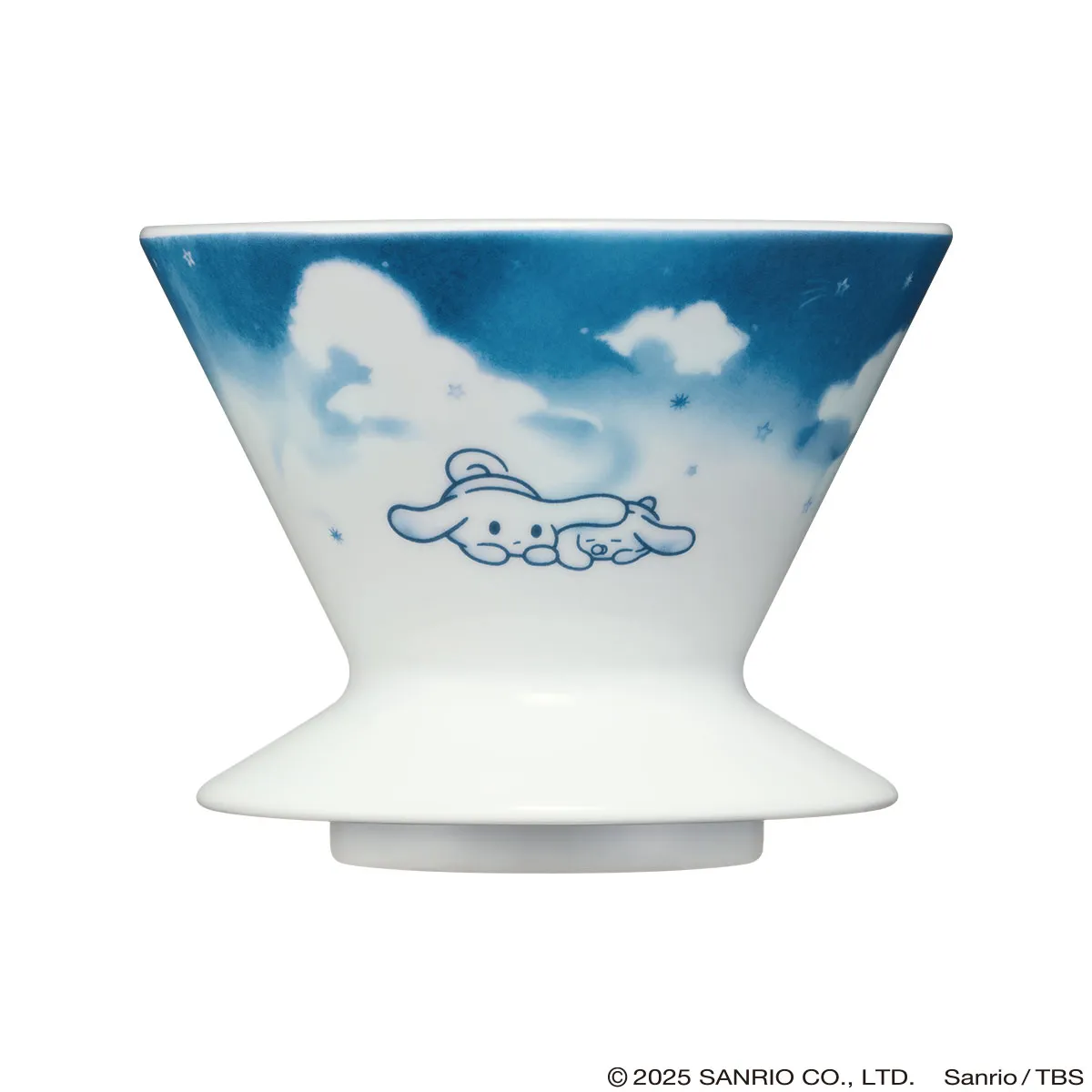 白磁の美しい白に藍色で空と雲が描かれた、円錐型のドリッパー。I.CINNAMOROLLのロゴマーク、ゴロゴロするシナモンとお友だちのミルク、ふたりのキュートなうしろ姿が、三面にデザインされています。