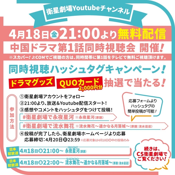 「#衛星劇場で永夜星河」もしくは「#衛星劇場で流水舞花 #流水迢迢」でXに投稿したら、