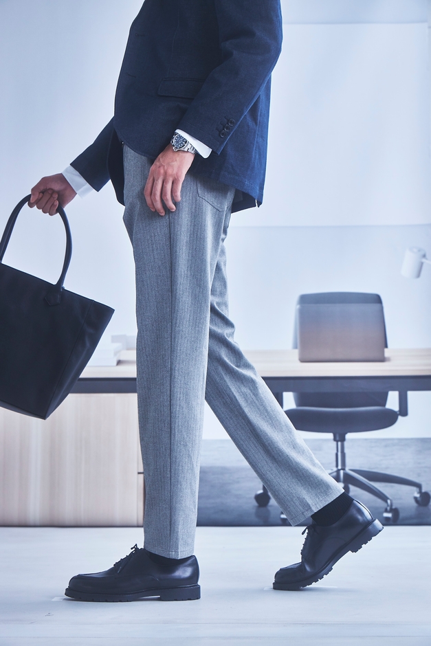 スラックスをベースにしたパターン設計でジャケットにも合わせられる着回し力を実現。