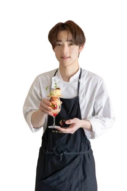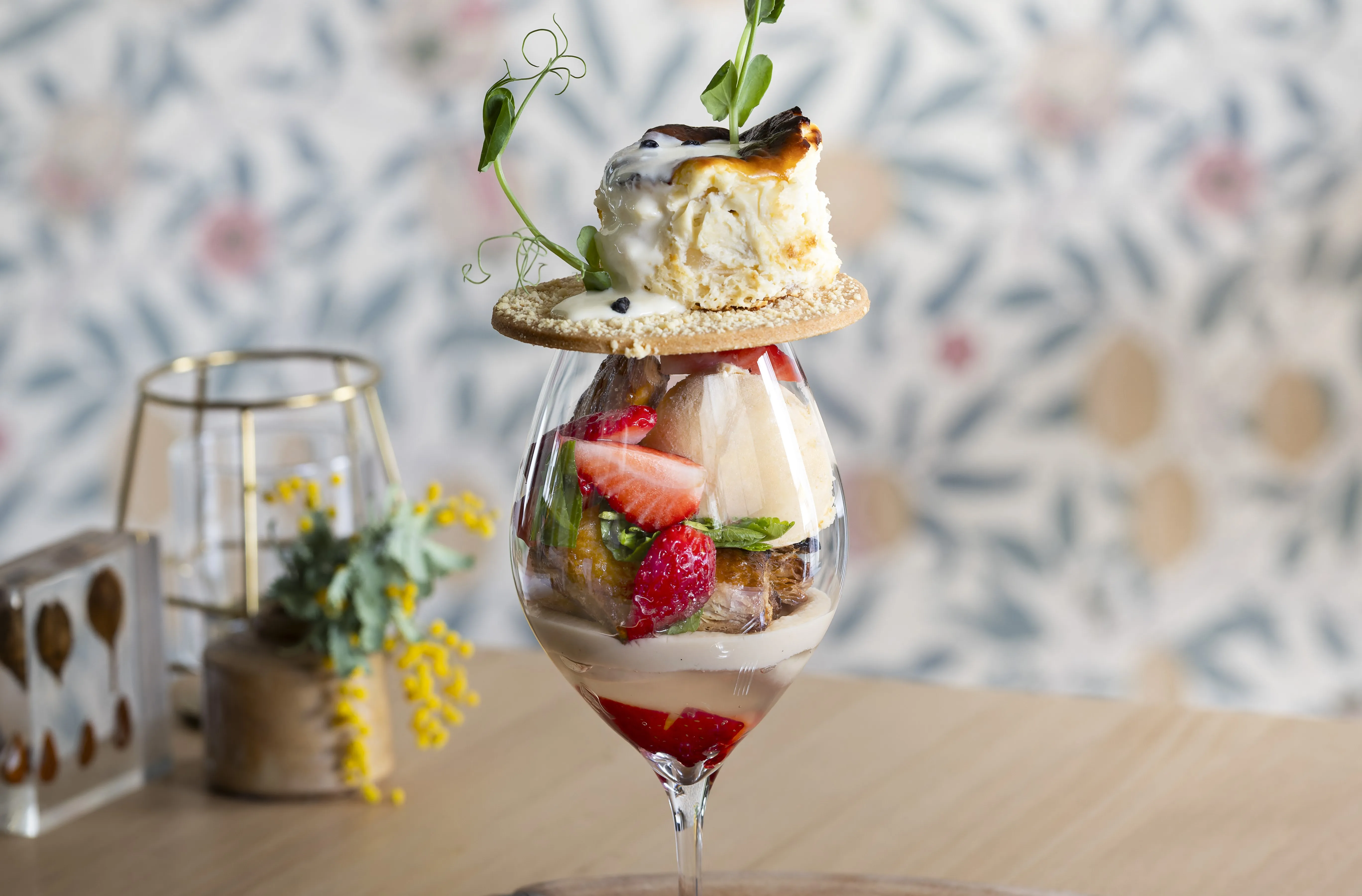 自家製パイをベースに烏龍茶のカスタードクリーム、苺を合わせたミルフィーユ仕立てのパフェに仕上げました。グラス上に甘みのある新玉ねぎのチーズケーキをのせ、仕上げに貝出汁のクリームソースをかけています。ちょっと変わった大人向けのデザートです。