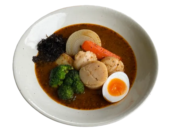 化学調味料を使わず様々な食材に25種のスパイスをブレンドしたスープカレーに、濃厚な甘みが特徴の別海産ホタテをトッピングしました。