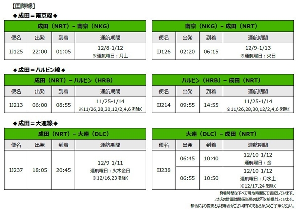 JALグループのLCCであるスプリング・ジャパン株式会社(以下:スプリング・ジャパン)は、2025年度冬ダイヤの成田=南京線、ハルビン線、大連線の運航を以下のとおり決定し、本日15時より販売を開始します。最新のダイヤにつきましては、スプリング・ジャパン公式サイトをご確認ください。