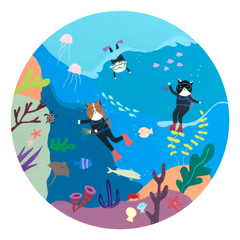 私の5回目の個展であり、東京で行われる2回目の展示<I'm feline good>ではボンボンがテニスをしたり、プールに行ったり、花見を楽しんだり、釣りをしたりして日常を楽しむ。 ボンボンの兄と姉のドゥンドゥンとコンコン もこの余裕のある日々に共にする。 現実で猫たちの時間は私と同じように流れないが、絵の中で猫たちの歳月は私を追い越さない。